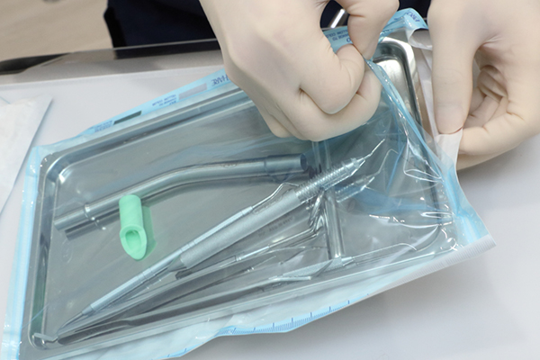 ミラーやピンセット、タービン(歯を削る道具)などの歯科用器具は個別パックを行い、滅菌し、管理しています。